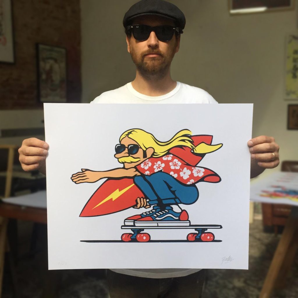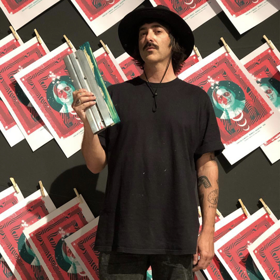 Creció escuchando bandas de rock, entre posters de los 80s, el surf en la ciudad feliz y el skate. Hoy sus grandes trabajos como diseñador acompañan a bandas como Mac DeMarco, Foals, Ratatat; a nivel nacional su estética se impregnó en posters para Morbo y Mambo, Nairobi, Turf, Dante Spinetta entre otros.